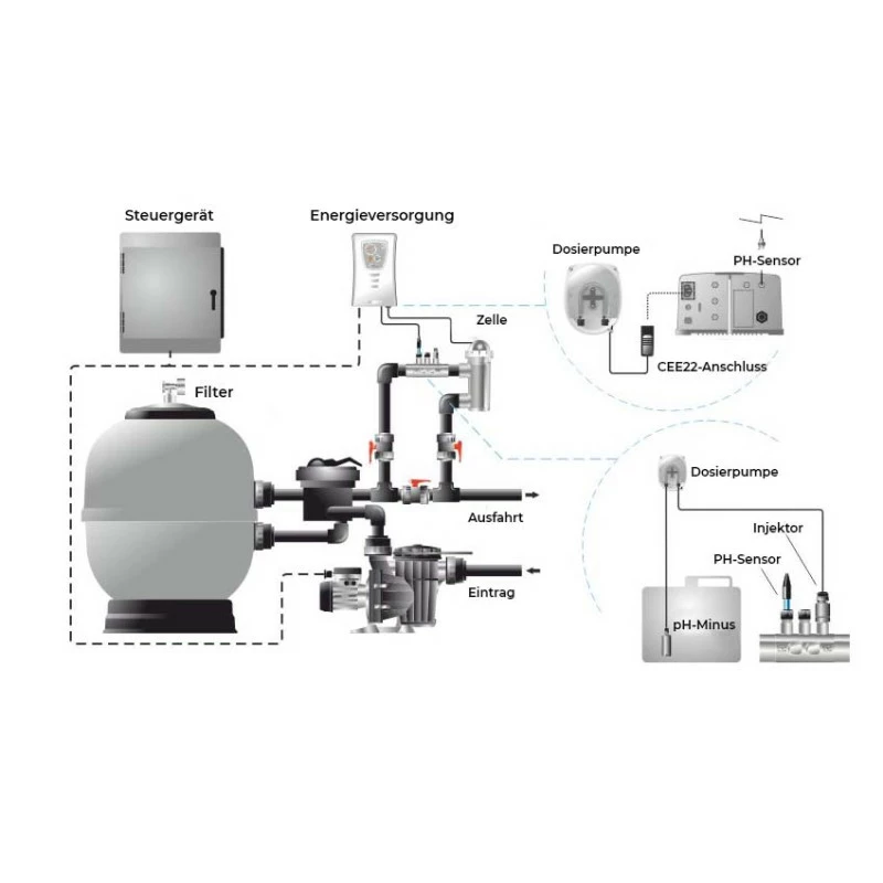 El clorador salino se debe conectar al sistema de filtración del agua para que, cuando el agua retorne a la piscina, una vez haya realizado el proceso de filtrado, se le suministre el cloro. El cloro, en contacto con el agua tiene un alto poder desinfectante. Destruye todos los microorganismos, bacterias y virus presentes en el agua.