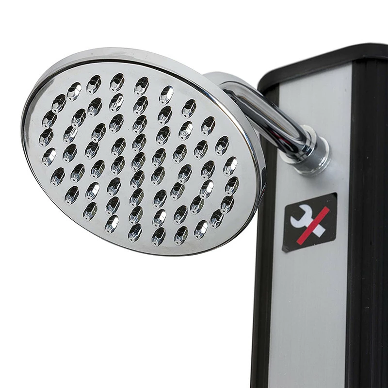 La ducha está fabricada con PVC en un color negro con acabado plateado que le aporta un estilo discreto y atractivo. Constituye, además de un elemento útil y práctico para verano, el complemento estético perfecto para el jardín.