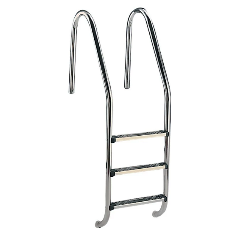 La escalera modelo Estándar es la escalera más clásica y común en las piscinas enterradas. Por su diseño y dimensiones el pasamanos sobrepasará la piedra de coronación facilitando así su instalación. Los peldaños inferiores descansan en la pared de la piscina, para ello se suministran unos topes de plástico para no dañar la pared o revestimiento de la piscina.