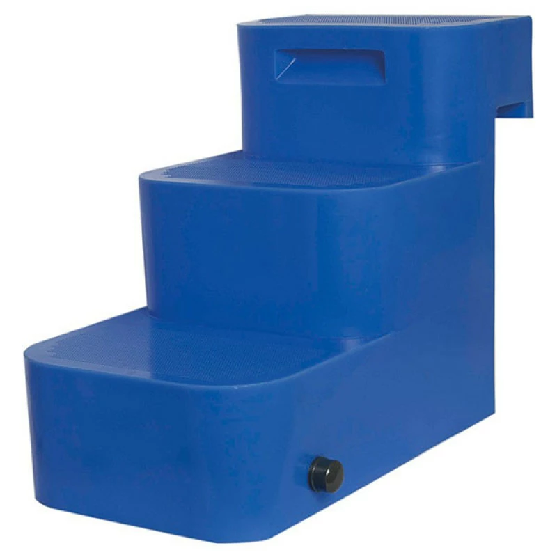 La escalera de color azul está fabricada en plástico. Es de sencilla colocación, e incluye un asa ergonómica en el peldaño superior para facilitar su integración con la escalera de acero.
