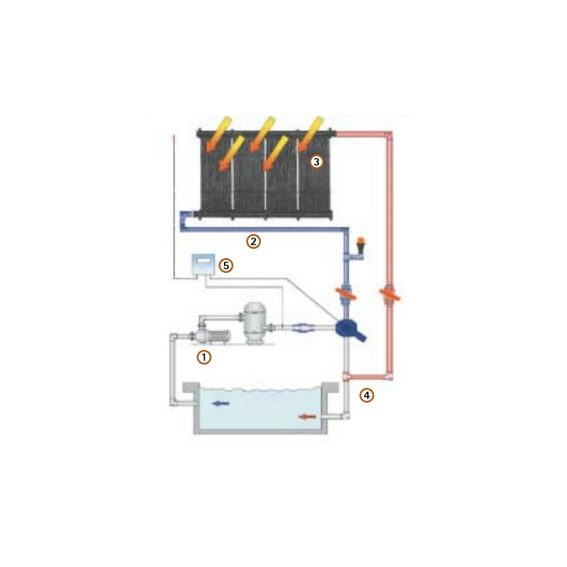 1- La bomba instalada en la piscina se encarga de dirigir el agua hacía los colectores solares con la ayuda de una válvula motorizada controlada.