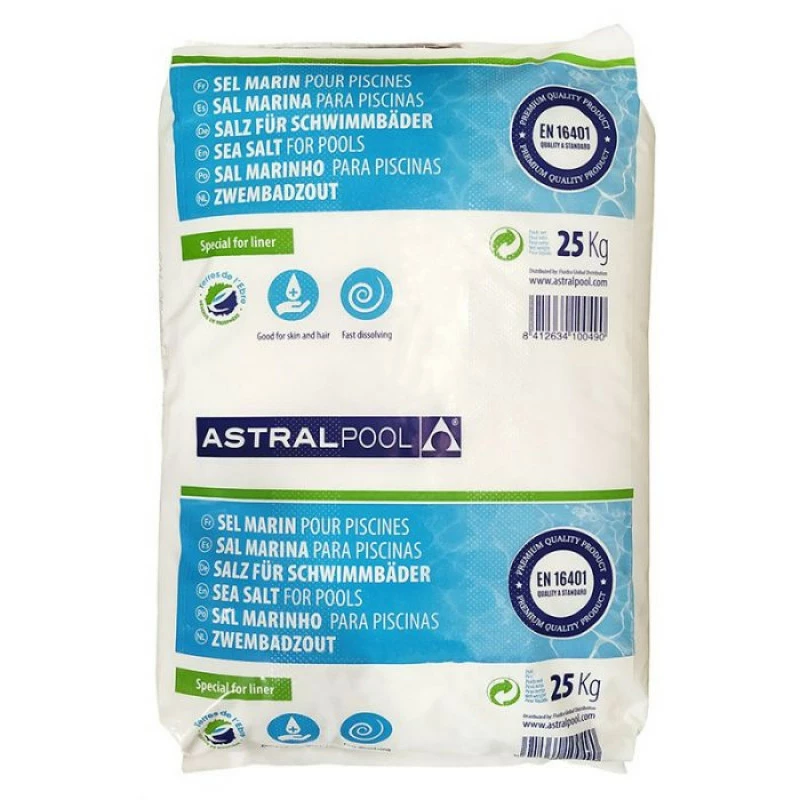 Saco de sal granulada de 25 Kg para piscinas con sistemas de cloración salina. Se comercializa en pack ahorro de 8 sacos de 25 Kg (200 Kg en total). Sal marina seca y granulada conforma a la norma europea EN 16401/A (sal calidad A).